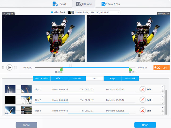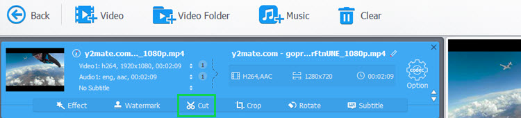 Cut: If a part of your GoPro video has no sound, you can cut that part off. Click Cut icon, and drag the two green knobs to freely cut needed clips of your GoPro video. You can cut more than one video clips and merge then into one output video.