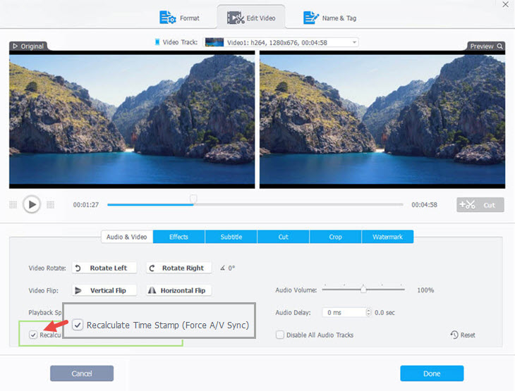 Fix GoPro video and audio out of sync: If you find your GoPro video and audio are out of sync, you can tick Recalculate Time Stamp (Force A/V Sync) under Audio & Video to fix it.